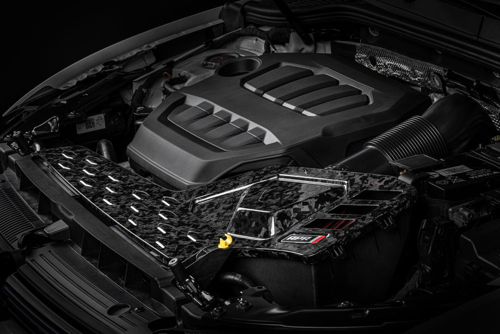 The APR Intake System is sold as an open system but can be configured as a closed system design by adding this cover. This cover is made from Carbon Fiber with a forged pattern and snaps into place without the need for any tools. Additional airflow paths allow the system to pull additional air on high power setups, while also allowing more turbocharger sound.