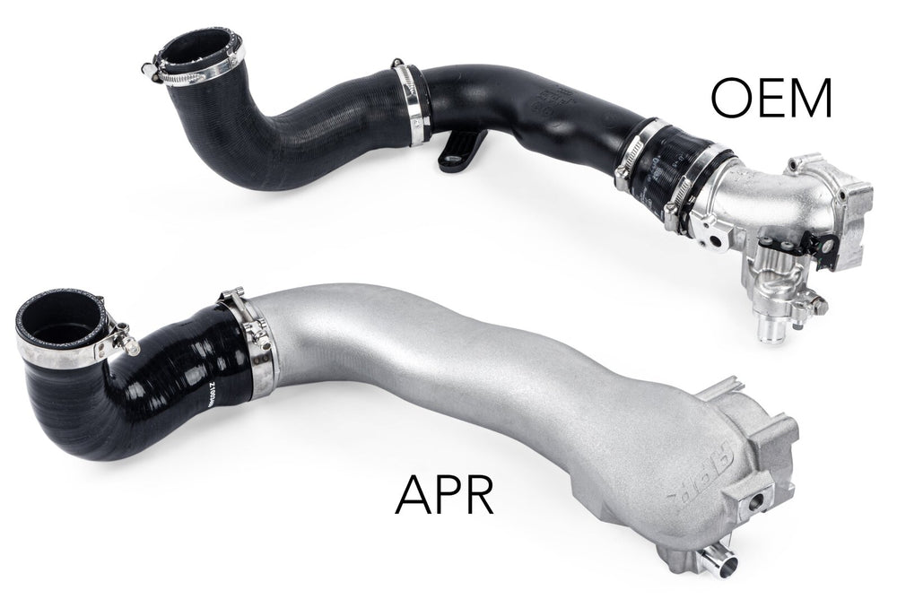 The APR Throttle Body Inlet System is a comprehensive upgrade to the factory charge pipe system from the intercooler outlet to the throttle body. We replace all components and provide a new, larger, free flowing system that flows roughly 34% more than stock! This was achieved by increasing the cross sectional area of the system and by reducing the tight radius bend directly in front of the throttle body.