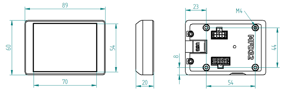 With its dimensions of 89 x 60mm, the display is very compact. In addition, the M4 threaded sockets on the back enable individual and secure attachment.