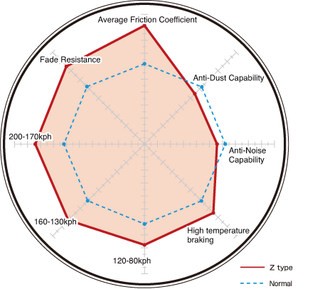 The development concept of the Z-type brake pad is a high performance brake pad for street-use. For the testing, cars like Subaru Impreza WRX, Mitsubishi Lancer EVO, BMW M3, and Porsche Cayman S were used with high performance radial tires. The pads went through extended road trials on the street followed by rigorous testing on the race circuit.