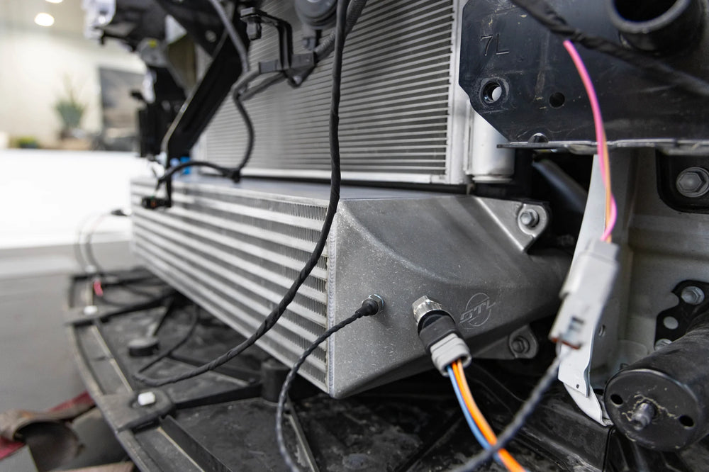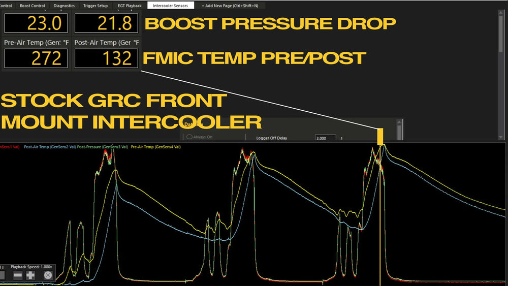 We went head to head VS the stock GRC intercooler and absolutely blew it out of the water. The difference is huge and it’s real! We tested the two intercoolers on a bone stock GRC with NO TUNING while data logging through one of our Haltech Elite 1500 ecu’s. Outside air temp was 55 degrees Fahrenheit and our dyno fans were on the same settings for each pull. We also did 3 back to back pulls to get it nice and hot but to also find an average. We know from testing this car in the past that heat soak is a big issue, we’ve noticed doing consecutive pulls the HP number kept decreasing with the stock FMIC. To compare this to a real life scenario think of it as losing power going into lap 2 or 3 of your track day. However with our new intercooler that was not the case at all, it actually increased in power with each pull. Our cold side actually never went above 70 degrees Fahrenheit while the oem FMIC touched 140! This proves in itself you will be able to run longer cooler track days without worrying about making less power!