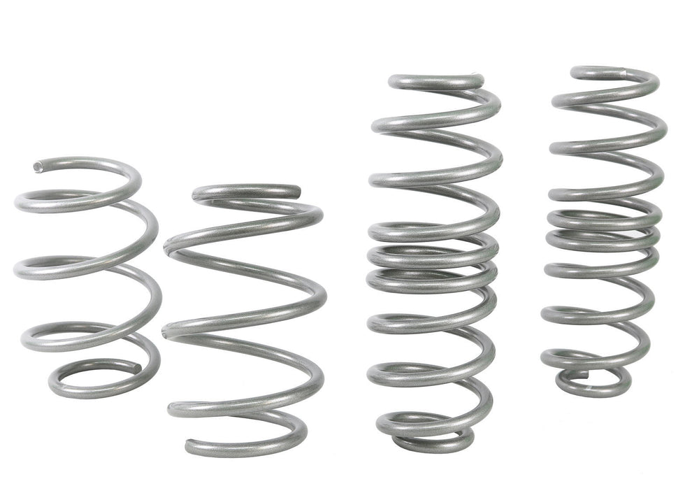 Whiteline Springs deliver improved vehicle performance whilst maintaining safety and ride quality characteristics. This kit contains 3.3kg/mm (185lb/in) front rated springs that provide a 25mm drop while the 2.9kg/mm (162lb/in) rated rears deliver a desirable 25mm to the vehicle. By lowering the vehicles centre of gravity, the unique and progressive rate coil design not only improve performance but enhance overall appearance. Developed and manufactured in Europe from the highest quality materials, coating and to the finest tolerances guaranteeing exact fitment. Whiteline Springs are engineered for optimal balance with OEM and aftermarket shocks. For total grip activation match with Whiteline Sway Bar and Essentials kit for unrivalled handling and optimal vehicle performance.